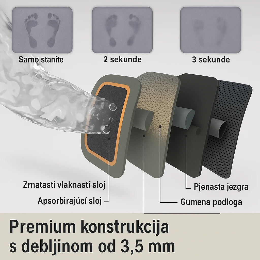 Superupijajuća kupaonska prostirka pruža savršenu kombinaciju funkcionalnosti i udobnosti. Zahvaljujući izuzetno upijajućem materijalu, učinkovito skuplja vlagu nakon tuširanja, ostavljajući pod suh i siguran. Mekana površina pruža ugodan osjećaj pod nogama, dok neklizajuća podloga osigurava stabilnost na pločicama. Idealna je za sve koji traže higijensko, praktično i elegantno rješenje za svoju kupaonicu.