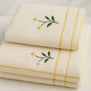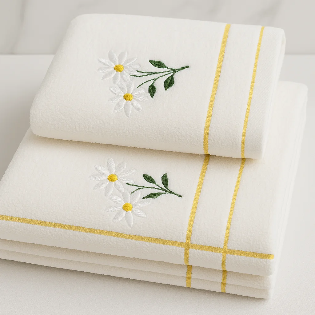 Unesite prirodnu umirujuću notu u svoju kupaonicu s našim Kamilica ručnicima. Klasična bijela podloga oplemenjena je nježnim motivom kamilice i paspulom u toploj zlatno-žutoj boji, donoseći osjećaj čistoće, svježine i blagostanja. Savršeni su za svakodnevnu upotrebu, a istovremeno dovoljno dekorativni za posebne trenutke.